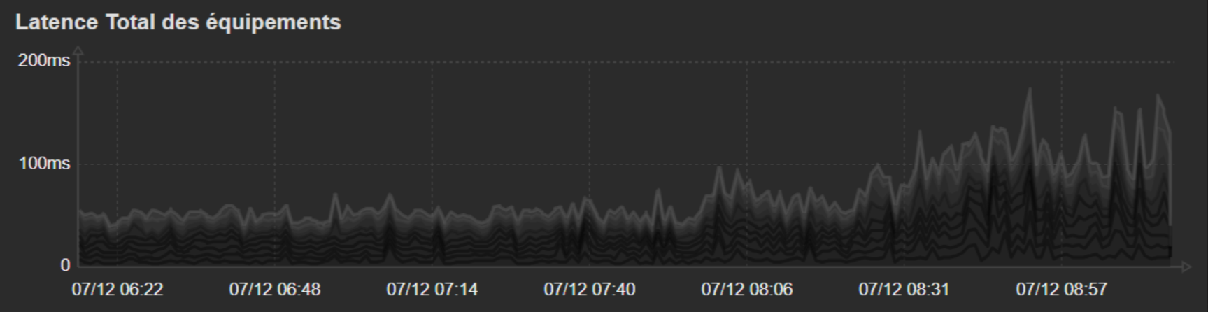 A partir de 8h30 le 07/12/2023 nos outils de monitoring nous ont remonté une montée en latence anormale